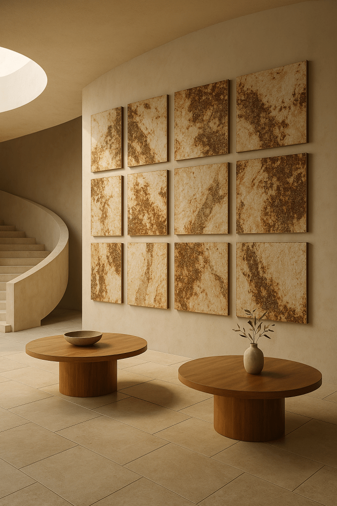The Fungal Art Series® offers a natural, biodegradable alternative to synthetic acoustic and decorative surfaces. Each panel is a co-creation between nature and design, forming sculptural textures with organic uniqueness.